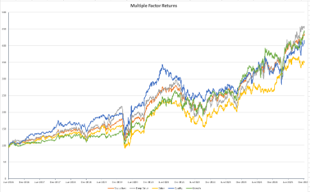 As we have made clear in this piece over many months, we do not see the need to split the world into US vs non-US exposures but prefer to reflect – on an equal weighted basis – exposure to all developed market assets on a stock selection basis. We report all returns in US$ for comparative reasons, but clearly the currency base of the investor is the main reason for management of currency/county exposure longer term. The 2025 performance of our Global multi-factor strategy (+31.6%) where we risk manage factor exposure via regular rebalancing and stock selection (but do not make country or factor bets in order to do so) is testimony to how both US$ and non US$ assets can be successfully combined into a global portfolio model without the requirement to make country or sector based exposure decision.