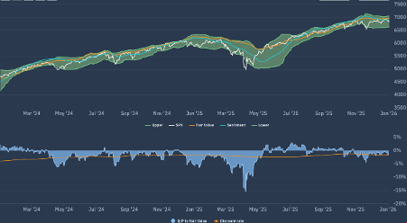 To add context to this, we can review the Apollo market chart for the (market Cap weighted) S&P500 shown in chart 2 below. The increase in market certainty/predictability that could be seen over the summer months (the narrowing of the FV range) has widened significantly since November as uncertainty about near term returns (particularly in relation to talk of “an AI “bubble”) and risk unwinds in Crypto accelerated. On a similar basis, whilst our proprietary measure of sentiment (the blue line) has now flattened. As we noted in the November report, we anticipated that the shakeout for equities in November to be manageable and so it has proved. Whatever the view on issues such as AI, Mag-7, Crypto or Geopolitics, the market is entering 2026 with these risks clearly in view. The width of that FV range (when contrasted to the narrowness of the summer) is more “normal” on our view – redolent of the early part of 2025 when a steady drip-drip of relative disappointments in Tech led that sector to perform poorly in Q1.
