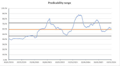 We began the report with a few thoughts about the outlook for 2026 in terms of the headline S&P500 index through our own, Apollo forecast lens as a means of contextualising how top down and bottom-up forecasts of returns should be combined on a continuous basis for understanding risk and return. Those forecasts highlight a generally positive view on the market but, as Chart 1 illustrated, with a wide range of probable outcomes in respect of it. The “width of this probability range – like the FV range width in Chart 3 provides us with another helpful indicator of uncertainty – or as I prefer to refer to it – predictability. There are periods of time where this range is widened out by increased uncertainty and how predictable the market is inversely related to that- the wider the range – the less predictive the model. Chart 5 shows this as an historic time series within a simple Standard deviation framework and we can see that current levels of “predictability” are close to normal (also visible on the log-based Chart 1). Despite the volatility, directional returns have been solid since the market lows of 2022 and the sense that market beta is persistent underpins our generally positive market forecasts.